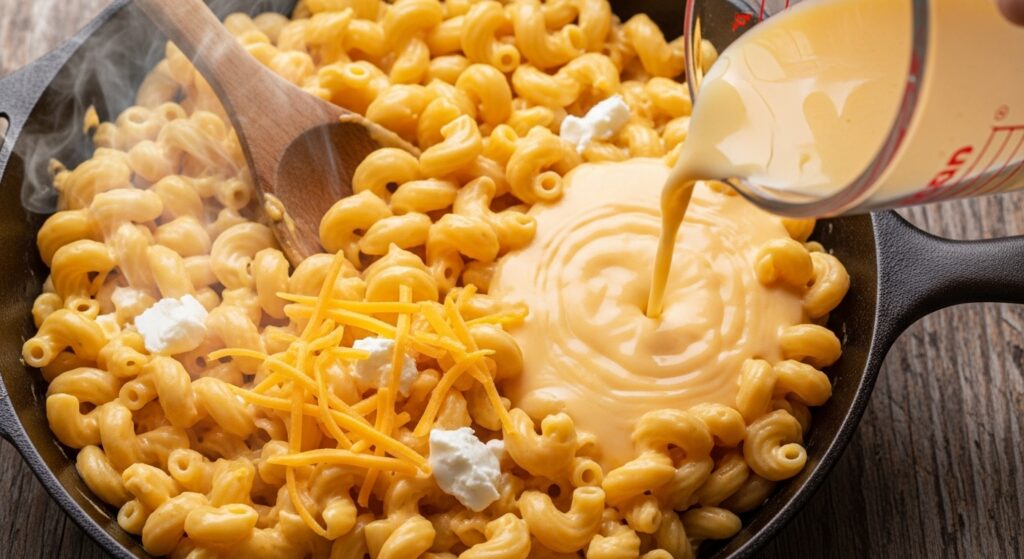 Lower the heat and add cream cheese, shredded cheddar, and milk. Stir until the mixture is melted into a creamy sauce. Add the pasta and toss to coat, adding the reserved pasta water a little at a time to achieve your desired creaminess.