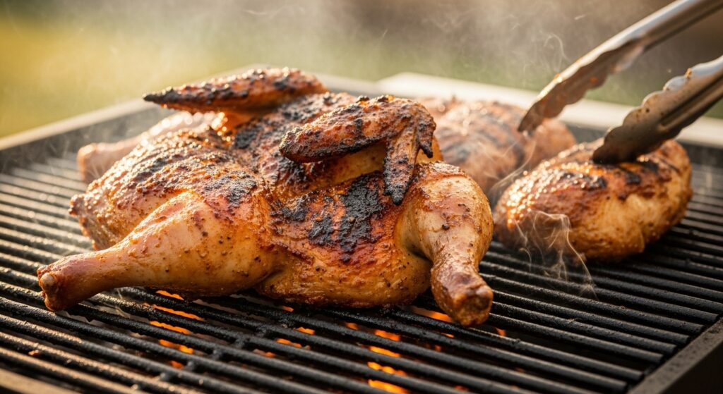 Preheat grill to medium (350°F/175°C). Grill chicken skin-side up over indirect heat, covered, for 45–60 minutes. Baste with reserved sauce every 15 minutes. Finish over direct heat for 5–10 minutes until skin is crispy and slightly charred.